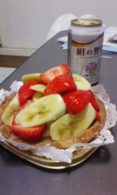 いちごとバナナがどっちゃり乗ったタルトです。タルトなんて年単位で食べてない気がするな(´ω`) 先月におかんの誕生日のケーキ選びで迷った挙句、そのとき選ばなかった方を自分用に買いました(*´∀`) おかんにこの画像をメールで送ったら、「タルトは好かん。やっぱり生クリームとスポンジ」とのお言葉を頂いたので、どうやら正解を引いたようです(;^ω^)