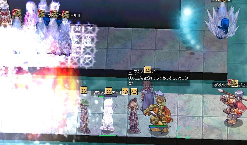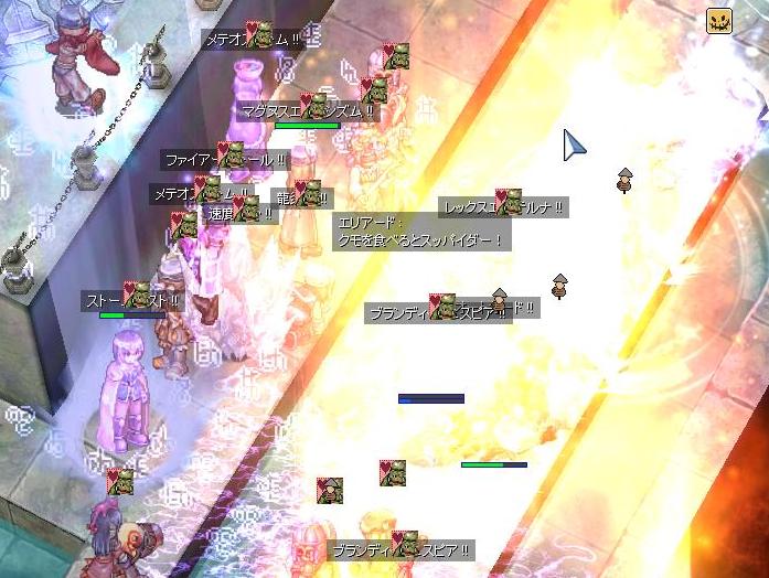 WS陣がアンフロを破壊したのか相手が凍る凍る。突入のたびにジョークをばらまくものの内周からのADSで落とされる。後衛陣まで達してた人もいたようだけど、献身つきのWIZを落とすには至らず阿修羅&ADSの餌食に。決定打を欠いたまま終了時間を迎えてしまいました。敗因は火力の差と教授やクリエがいなかったことかな…。献身つきのWIZがどうしても落とせないですね。でも結果は残念でしたが熱い戦いで楽しかったですノ(´д`*)