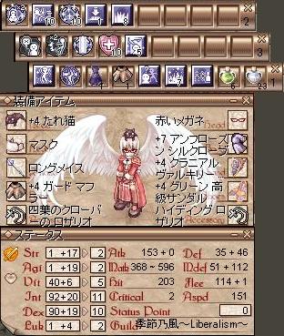 といっても、基本的に左手のホームポジションとその周辺、あわせて15個しか使えません(;゚д゚) ヒールとアスム、あと対Mobでよく使うスキルをホームポジションに。支援系と咄嗟に使いたいハイド・SWは上段。肩持ち替えとクロークが下段です。サンクとテレポ、緑・白ポはファンクションキーで使ってます。よく間違うのがハイド⇔SW、LA⇔HLかな…。特にHLでカトリのタゲを奪おうとしてLAになってしまうのが痛い。Cのミスリルマジックマントは風耐性です。最初はぼろマントでしたがそのときよりも安定した感じです。ちなみにアンチマジックスキルには期待してません。ただの「MDEF+2のs肩」という感じで使ってます。露店で100kも出さずに買えますしね。