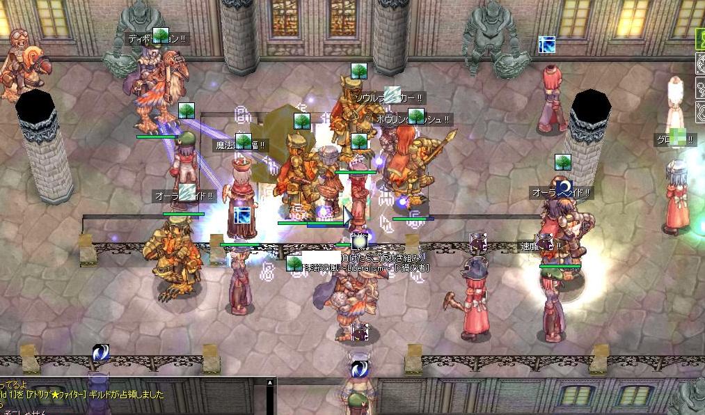 …30秒前に落城(ノ∀`) 8人じゃ終了直前の本気レースは抑えきれなかったです…。毎回の反省を生かそうとしてるんだけど、いかんせん人数がね…w あと重すぎて頻繁にスキルが不発するのが辛い(特にSWサンク)。せめて不発がなくならないと抑えるのは不可能だ…。でも反省会を見てると、回を追うごとにメンバーの熱意が上がってるのを感じます。いつかきっと取れるよね!ヽ(´ー`)ノ